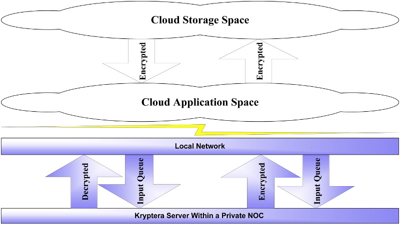 A Kryptera server hosted in a private network is used to decrypt files brought down from Cloud space, and encrypt files before transport into Cloud space.